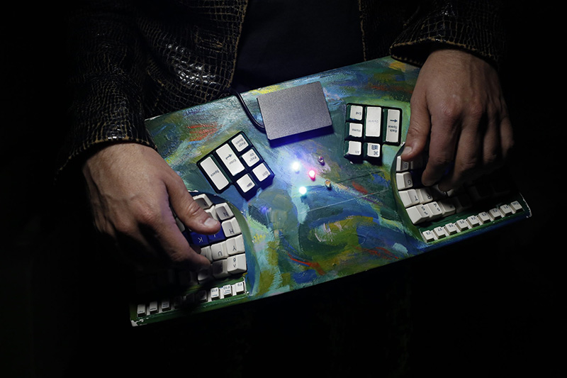 Leon’s goal was to build an interval-based instrument, one where keypresses stood for interval changes in pitch, rather than fixed pitches. This would encourage musicians to focus on melody creation organically, even without formal training. Initially, he experimented with traditional keyboards but found their layout too restrictive. Instead, he turned to an ergonomically designed QWERTY computer keyboard, creating the Samchillian Tip Tip Tip Cheeepeeeee (or Samchillian for short).