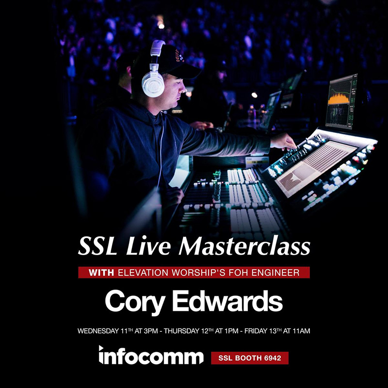 As part of the SSL's InfoComm experience, Cory Edwards, Production Manager and FOH Engineer for Elevation Worship, will be hosting a Live Sound Production Masterclass on all three days of the exhibition: Wednesday at 3:00 p.m., Thursday at 1:00 p.m. and Friday at 11:00 a.m. During the masterclass, Edwards will offer a workflow deconstruction of his touring set up using the SSL Live L650 console.